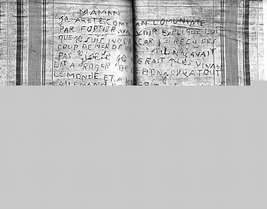 Maman, j'ai été arrêté comme étant communiste par Fortier. Va le voir, explique lui que je suis innocent, car j'ai reçu des coups de nerf de bœuf. S'il n'y avait pas Gisèle, je ne serais plus vivant. Dis à Roger de dire bonjour à tout 1e monde et à Kléber de venir avec l'allemande de Littry et à Sobry de dire à Raymond de parler pour moi. Milles baisers à petite Gigi, Maman, Papa, Yolande et aux amis. A bientôt. Je suis innocent ".Gigi = sa fiancée