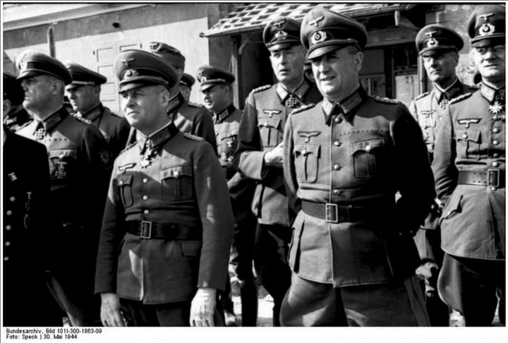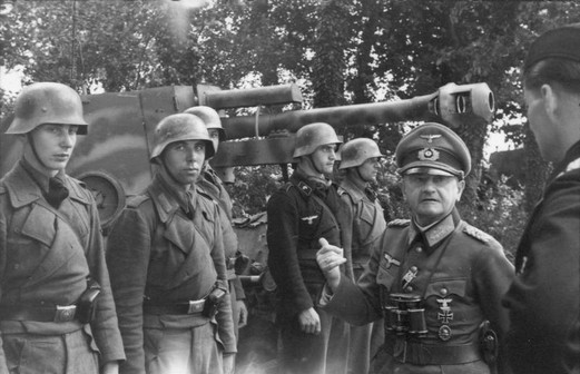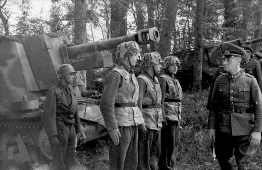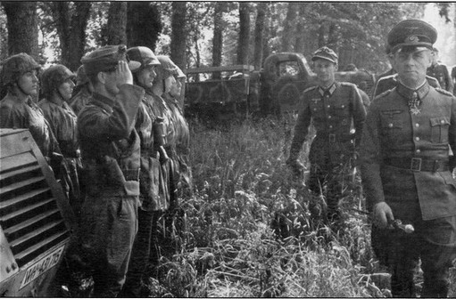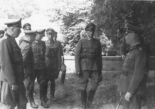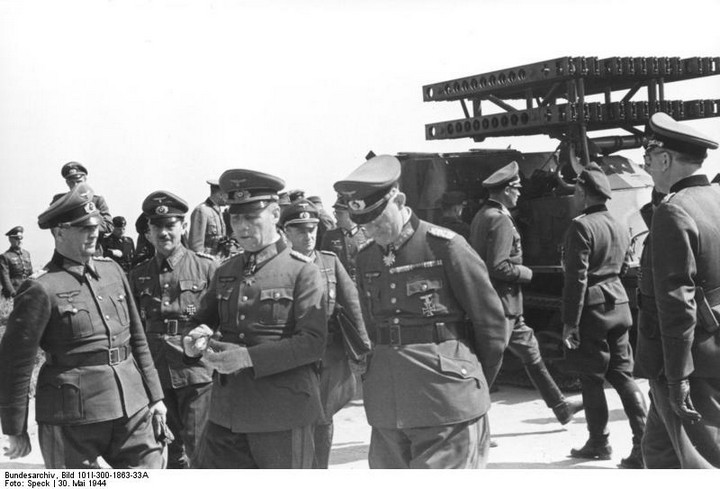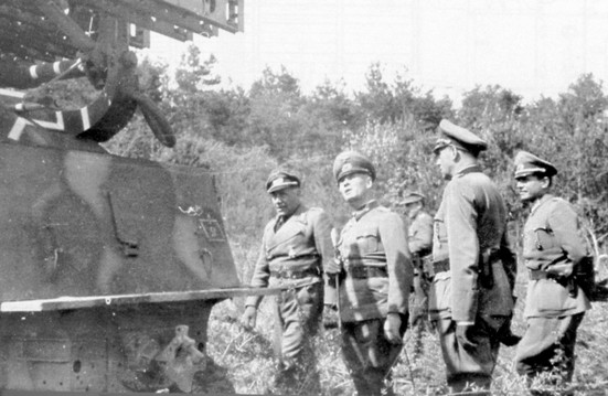 A gauche: de g. à d.: Dollmann de profil, Feuchtinger de face et Rommel de profil. A droite: Rommel inspecte, en compagnie du Generalmajor Edgar Feuchtinger (de profil)et du Major Alfred-Becker (à gauche), un des deux matériels Somua MCL 5 Mittler Gepanzerter Zugkraftwagen 5303 (f) mit 8 cm Raketen- Vielfachwerfer 20 Rohre affecté à la 10.(Werfer) Bat, Panzer-Artillerie-Regiment 155.