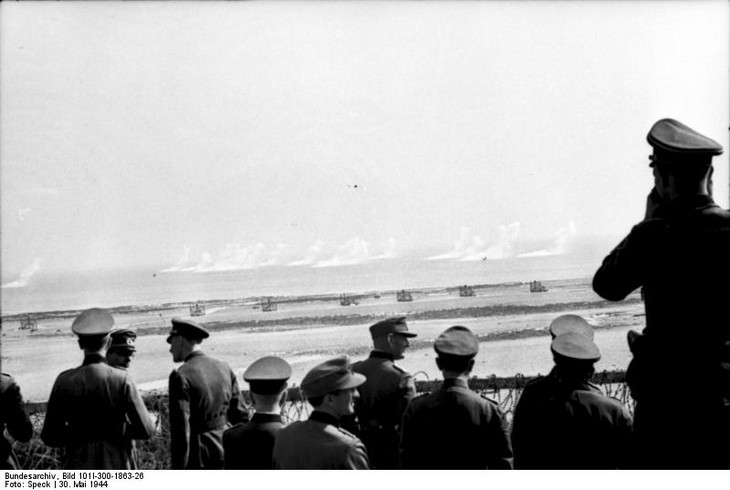 Source. A Lion sur Mer au Wn 21, le 30 mai 1944. De gauche à droite: Krancke, Buhle, Rommel, Jacob, et ?.