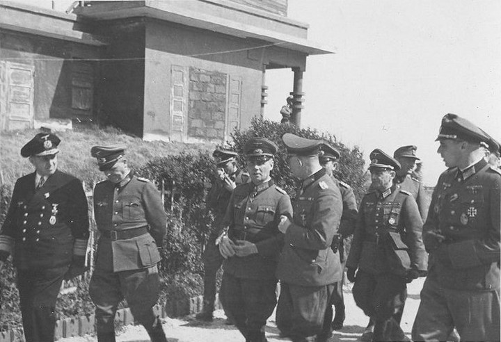 Source. A Lion sur Mer, le 30 mai 1944. Rommel avec Buhle, l'amiral Theodor Krancke à gauche, entre Kranke et Rommel: Dollmann, entre Rommel et Buhle ? et René Eberle derrière Buhle (la tête baissée).