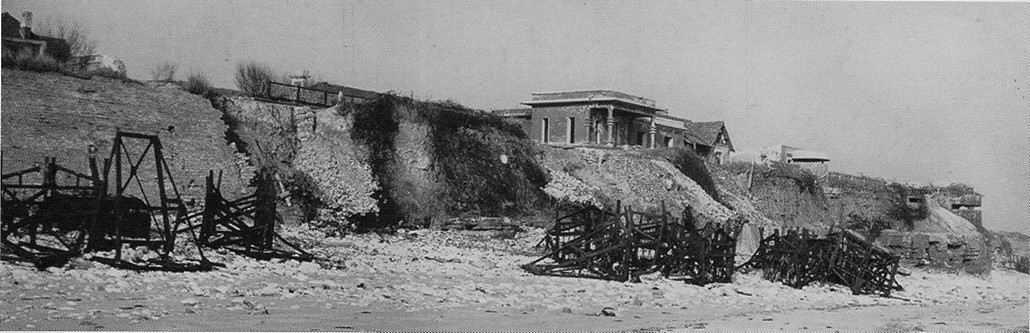 Source. La plage de Riva-Bella avec des barrières belges sur l'estran, en mer des explosions.