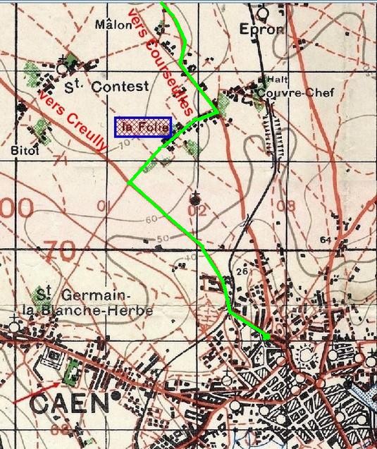 Ceux d'entre nous qui habitaient la côte, sont partis immédiatement à pied vers le jardin des Plantes, place Blot, avec l'intention de continuer par la route de Courseulles, mais là se trouvait un convoi allemand ou plutôt les restes d'un convoi allemand écrasé par les bombes le vendredi soir: véhicules divers, armements et munitions étalés sur le sol. C'était trop dangereux; nous sommes passés par la rue de Creully afin de contourner cet endroit mal famé et rejoindre la rue de la Folie. Par cet itinéraire, jusqu'à la Folie, pas âme qui vive, personne, des chars de combat calcinés par-ci, par-là. Il est vrai que nous suivions la route par sécurité, les champs pouvant être minés.