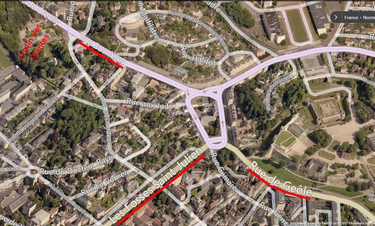 Mais en revenant, je me suis trouvé coincé rue des Fossés-Saint-Julien par un bombardement aérien. De chaque coté de la rue des Fossés-Saint-Julien, il y avait des abris creusés dans les trottoirs et recouverts où je me suis réfugié.