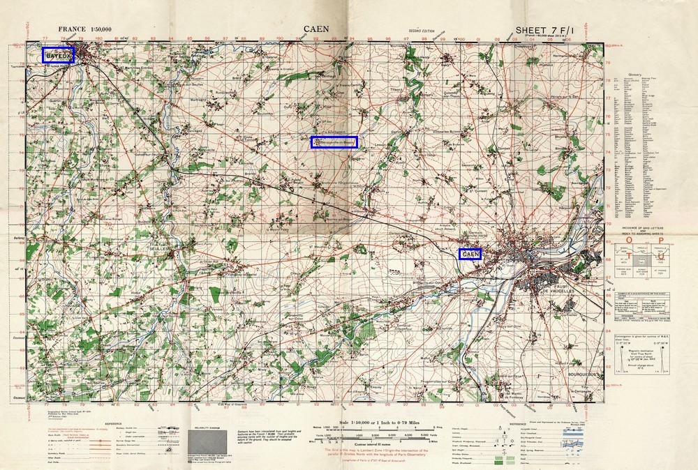 Localisation de gauche à droite: Bayeux, Secqueville-en-Bessin et Caen; carte War Office 1943.
