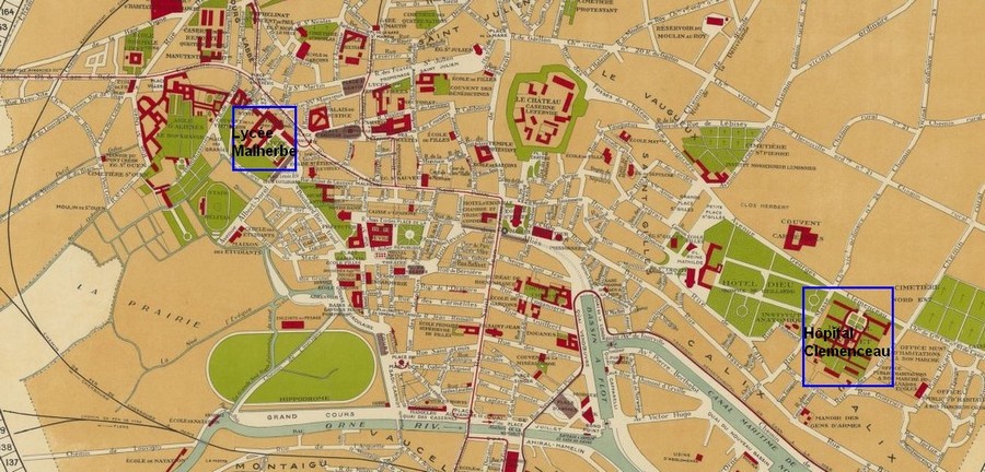Localisation du lycée Malherbe et de l'hôpital Clemenceau. AGRANDISSEMENT