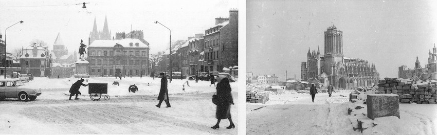 Hiver 1945, la place Saint Martin et la rue Saint Pierre avec l'église Saint Pierre