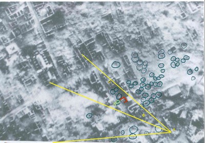 A gauche photo aérienne de la RAF le 12 juin, le bâtiment en croix au bout de la ligne jaune au centre l'église Saint-Jean, en rouge l'entrée de l'abri, les cercles bleus une tentative d'estimation des impacts de bombes !