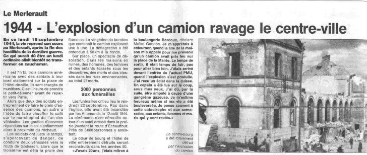 "Juste un mois après notre libération, le 18 Septembre nous eûmes à subir la plus triste aventure de la guerre, une catastrophe dans toute l’amplitude du mot, voici « le Lundi 18 septembre, à 7heures du matin, trois camions, chargés de bombes viennent de s’arrêter en plein bourg.