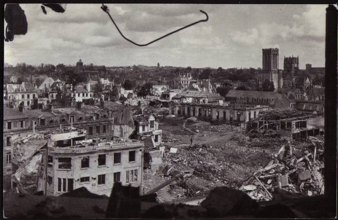 Document préparé à partir de plans des Archives Municipales de Caen, les rues ont été agrandies et déplacées à la reconstruction. Voir ici une photo prise à la fin des années 40 après le déblaiement et avant la reconstruction.