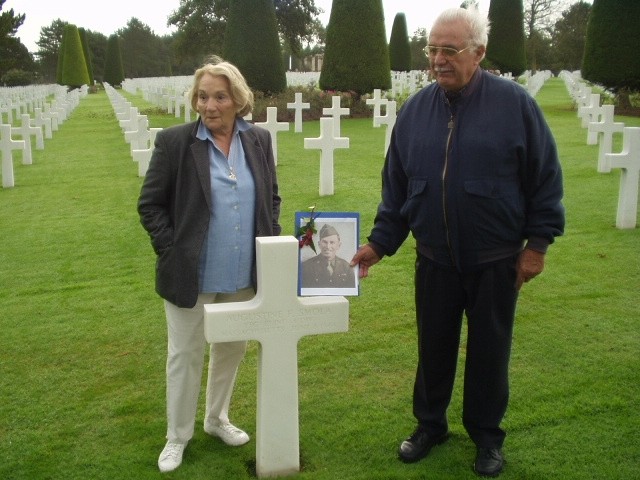 En 2005, avec mon épouse au cimetière de Colleville sur Mer. Avec la photo d'Augustine Smola, 4th US Infantry Division, 12th Infantry Regt, 1st Battalion, Company C. , débarqué à Utah le 6 juin vers midi, mort le 8 juin 1944 à Azeville. Cette photo a été envoyée à son petit neveu aux States.