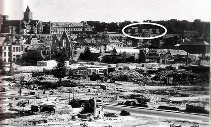 De notre 2e étage nous avions vue sur l'université (Note de MLQ: située dans le prolongement de la place Saint Sauveur, entre l'église et la rue aux Namps) , nous étions aux premières loges le 7 juillet pour le terrible bombardement : des vagues d'avions se succédant sans arrêt lançaient bombes sur bombes, ce fut un gigantesque incendie.