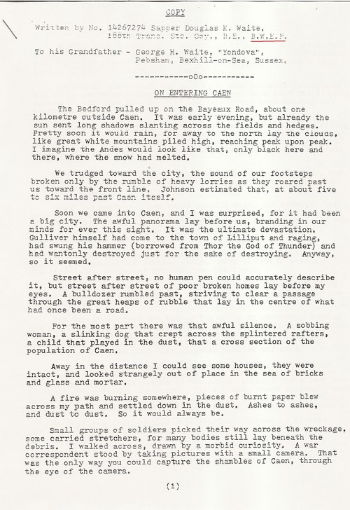 Quand je retournerai en Angleterre, on me dira que les V1 rappelaient le « Blitz » de quarante. On me dira :« Tu aurais vu Douvres !», alors je répondrai : « T'aurais vu Caen !»,« T'aurais vu Maidstone !», « T'aurais vu Caen !». Mais si on devait me dire :« Regarde donc la vie et la gaîté qui règnent ici et les enfants joyeux qui jouent dans la rue ! », alors là, je ne pourrais certainement pas rétorquer: « Regarde Caen ! ».