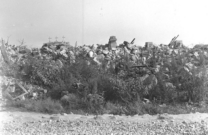 Le 9 juin à 02h00, un obus de 406 mm (16 pouces) du HMS Rodney emporte la flèche du clocher de l’église Saint Pierre qui s’abat dans la nef.