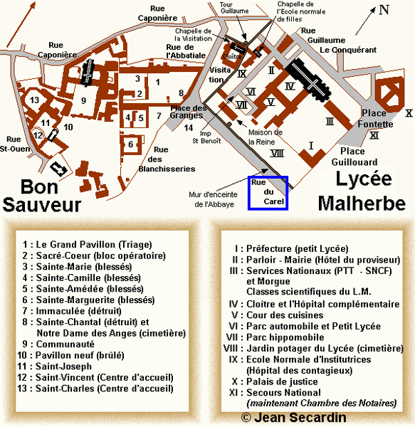 Dans la rue je réconforte de mon mieux tous ces pauvres gens et leur dit d’aller au Bon Sauveur, couvent qui doit recevoir les réfugiés et qui est tout près. Heureux ceux qui y sont allés, il n’y eut aucun mort, si : M. Geoffroy, capitaine d’armement à la Société Navale Caennaise, qui, ne se trouvant pas bien où on l’avait mis a désiré une chambre. Un obus, plus tard, l’a tué.