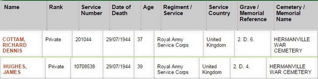 Une consultation de ce site donne 3 morts le 29 juillet 1944 pour le RASC, deux enterrés au cimetière d'Hermanville et un au cimetière de Ryes; on peut supposer raisonnablement qu'il y a eu deux soldats britanniques morts rue du Carel à Caen ce jour là et non trois sinon pourquoi deux cimetières différents, voici leur identité: