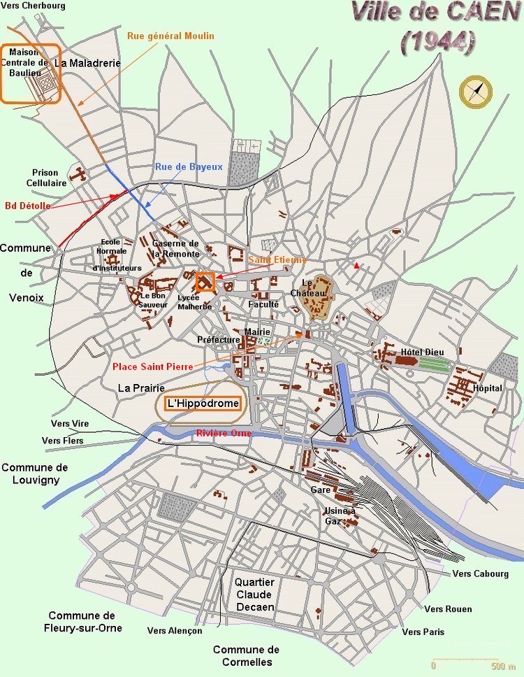 de la fourche de la route de Carpiquet aux abords des premières maisons de Caen.