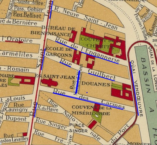 Il s'agit pour les autres, maintenant, de sortir des ruines de ce quartier. Là-bas, vers la rue Saint-Jean, les incendies déploient leurs flammes. Ne pourrait-on pas se diriger vers le port ? En groupe, nous essayons de gagner les quais par la sortie de la rue Guilbert, mais l'amoncellement des matériaux des immeubles écroulés est tel qu'il faut renoncer à passer par là. Nous regagnons le pensionnat pour nous diriger du côté de la rue des Carmes.