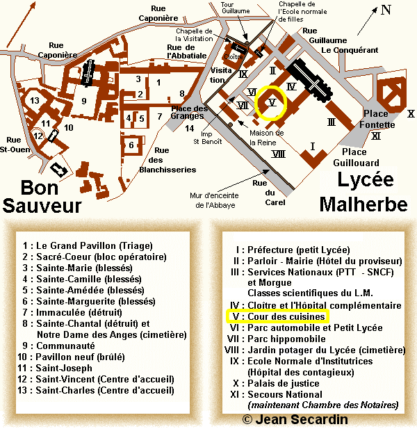 En bas de l'escalier, une première cave, relativement petite, encombrée d'énormes tonneaux ; une deuxième cave voûtée, très vaste, soutenue par deux magnifiques piliers ; un troisième réduit rectangulaire, la rotonde dans laquelle nous sommes ; enfin, une quatrième cave très vaste, également voûtée avec un pilier central. L'architecture de ces caves rappelle un peu les soubassements du Mont St-Michel, la salle des piliers, en beaucoup plus vaste. D'ailleurs, tous ces bâtiments sont l'ancienne Abbaye aux Hommes et à 1 000 ans de distance, nous apprécions les belles constructions d'autrefois. Bâtiments vastes, murs épais de 3 à 4 mètres aux étages inférieurs qui sont de l'époque, vaste cloître qui permettra de prendre l'air, malgré les obus, caves solides sous tous les bâtiments, immenses communs qui permettront l'installation de parcs auto et hippo et l'hébergement de milliers de personnes.
