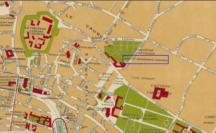 Comme tous les Caennais et les habitants de la côte, nous sommes, à l'Institut Lemonnier(Note de MLQ : Rue de La Pigacière, quartier Saint-Gilles (Orphelinat Le Veneur sur certains plans de l’époque), réveillés en sursaut par la canonnade monstre qui nous parvient de la mer... Cette fois on n'en peut douter : « Ça y est... » et chacun de sauter à bas du lit pour essayer de se rendre compte de l'ampleur du débarquement.