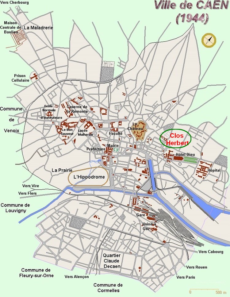 Note de MLQ: 11 km au Sud de Caen), dans la campagne environnante, où une tante est directrice d'école."On a mis du temps, on marchait mal à cause des gravats ».