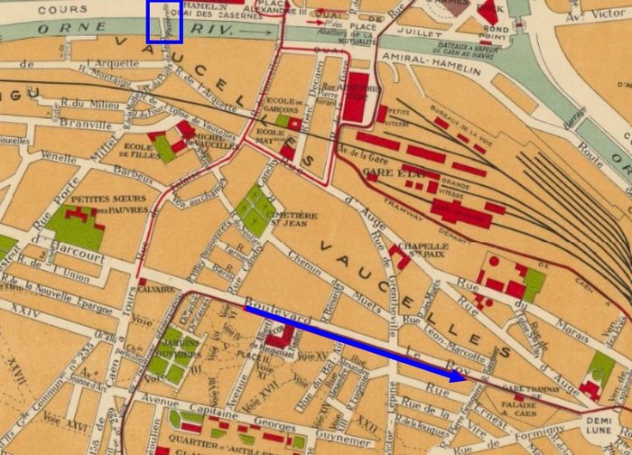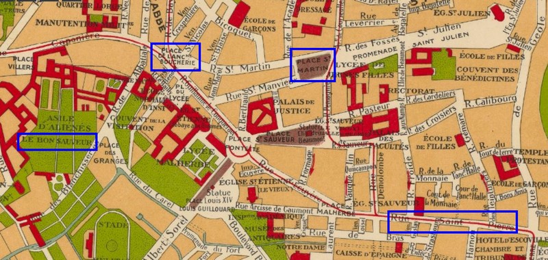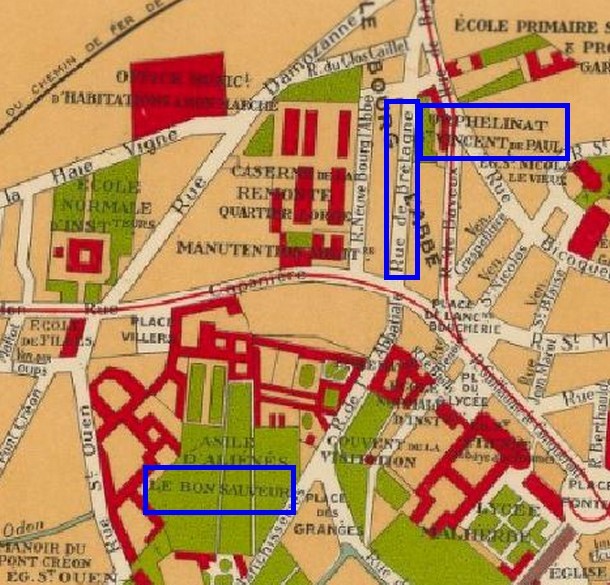 Localisation de l'orphelinat Saint Vincent de Paul au 59 rue de Bayeux, de la rue de Bretagne et du Bon Sauveur.