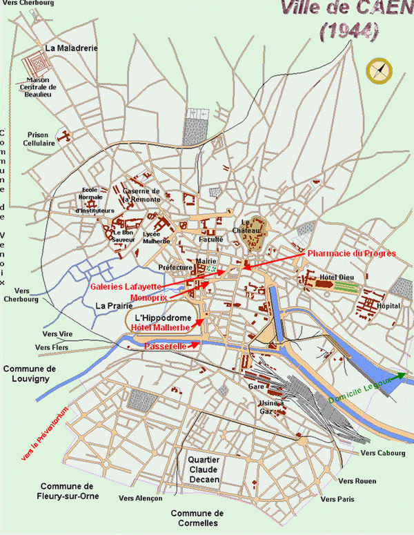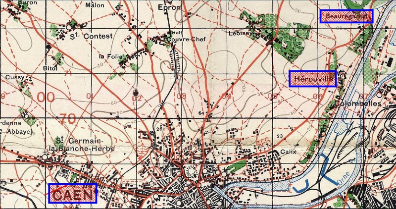 M. Marcel Legoux, qui travaillait aux Chantiers navals de Blainville. et son épouse habitaient, en juin 44, chemin du Lavoir. au bord du canal à Hérouville. (au bout de la rue Basse à la limite cadastrale Caen/Hérouville, le lavoir de nos jours, voir carte ci-dessous) "Le soir, quand nous regardions les fleurs et les légumes de notre jardin, on se demandait si on les récolterait car on parlait, depuis des mois, de débarquement."
