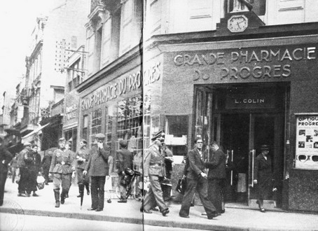 La pharmacie du Progès pendant l'occupation à l'angle de la rue Saint jean et de la place Saint Pierre.