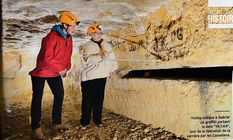 Yvette et les archéologues s'approchent du fond de la carrière, dans un espace où les plus grands doivent se courber. Sur les parois, au noir de fumée, sont inscrites des initiales ainsi qu'une date : "19.7.44" : le jour de la libération de la carrière.