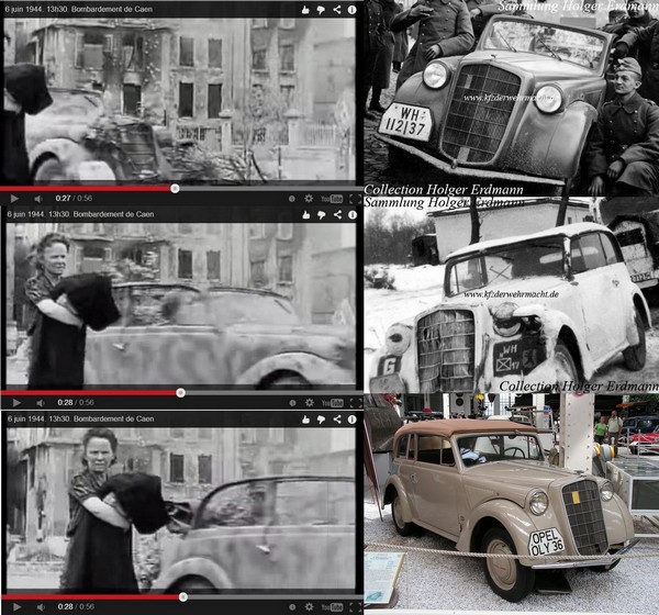 On aperçoit à gauche un chien et en arrière-plan une voiture décapotable, peinture couleur camouflage, remplie de soldats allemands.