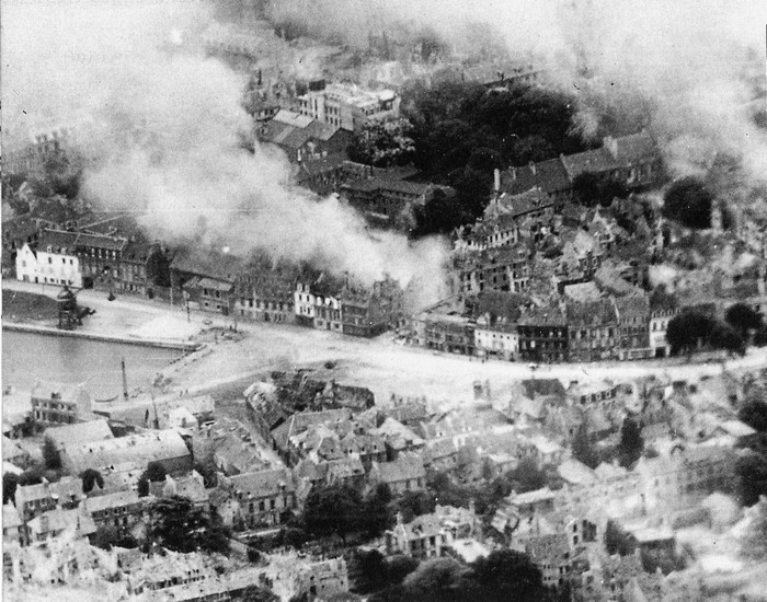 Photo aérienne prise le 6 juin après-midi, au centre en haut de la photo le monastère de la Charité avec les arbres du parc, un incendie rue Neuve Saint Jean, les bâtiments semblent intacts.