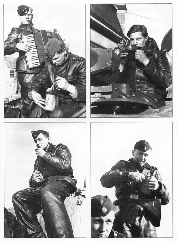 « Il fait très beau. Je suis devant la propriété de mes parents, route de Creully (de nos jours Allée de la Verte Vallée) à Caen - Nous sommes anxieux, fatigués par deux nuits sans dormir - Avides de nouvelles - Nous savons que Caen au bout de deux jours a terriblement souffert - Soudain, au carrefour surgissent cinq gros chars allemands qui se suivent - le convoi impressionnant stoppe net devant notre demeure - Ils ont l'air de chercher! Nous les regardons - A l'avant du premier char, (Ce sont des « Tigres» (pas de Tigre à Caen il ne peut s'agir que de Panther), debout, une femme de 28 à 30 ans, vêtue de noir, (On dirait du cuir la tenue des tankistes SS étaut en cuir noir.), la croix gammée sur le bras. Elle tient dans sa main droite un petit drapeau aux armes d'Hitler - dans sa fierté, elle nous sourit mais ses yeux brillent, son regard est de feu. Mais aussi, elle est belle- (la présence d'une femme habillée en tankiste sur un char allemand n'est pas explicable en l'état ! une supposition: Une souris grise en poste dans Caen qui aurait été sollicitée ou se serait proposée pour guider les chars sur la route de l'Abbaye d'Ardenne (ou du QG de la 716ème) à qui les SS auraient prêté une veste d'uniforme pour éviter qu'elle soit reconnue par des fantassins.)