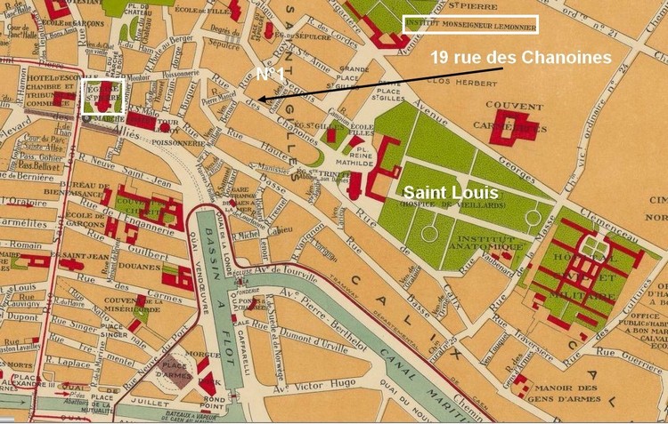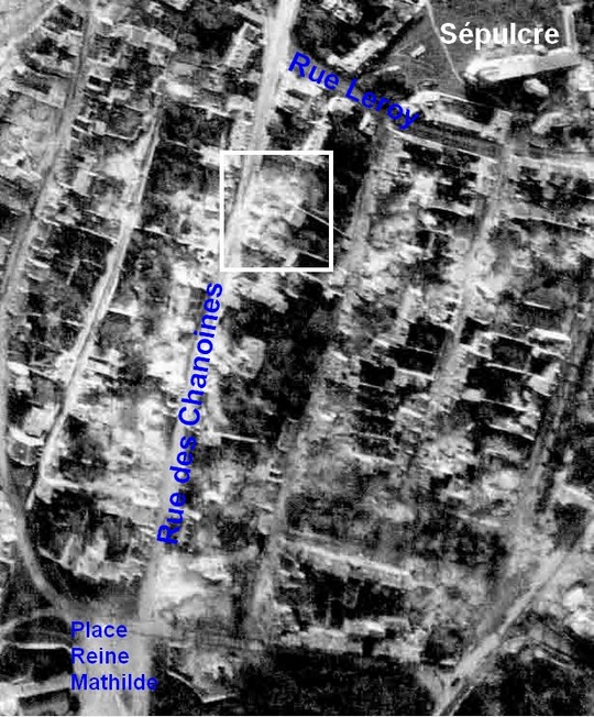 Localisation du 19 rue des Chanoines sur une photo aérienne de l'aviation alliée prise le 6 juin 1944 dans l'après-midi. Photo p011905.