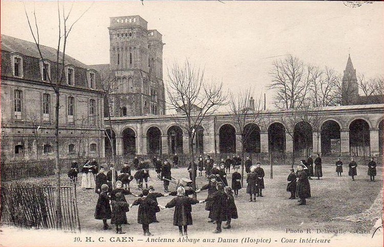 Source. La place de la reine Mathilde, à gauche, l'entrée de l'hospice Saint Louis dans l'Abbaye aux Dames, à droite l'église de la Trinité. Le photographe tourne le dos à la rue des Chanoines.
