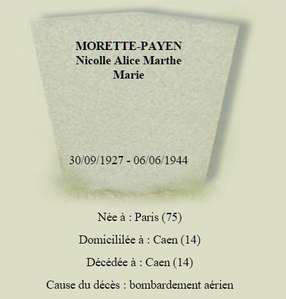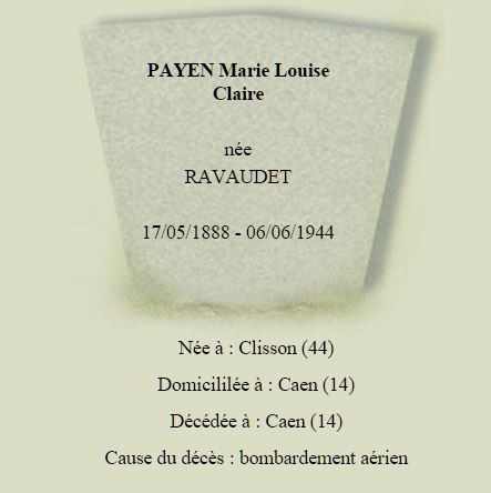 M. Payen retrouvera le corps de son épouse le 19 juin et celui de sa belle-mère le 21. Il quittera Caen le 4 juillet et sera à Paris le soir du 5 juillet. Lire en date du 7 octobre 1944 le témoignage de Mlle Jeanne-Marie Besnier.