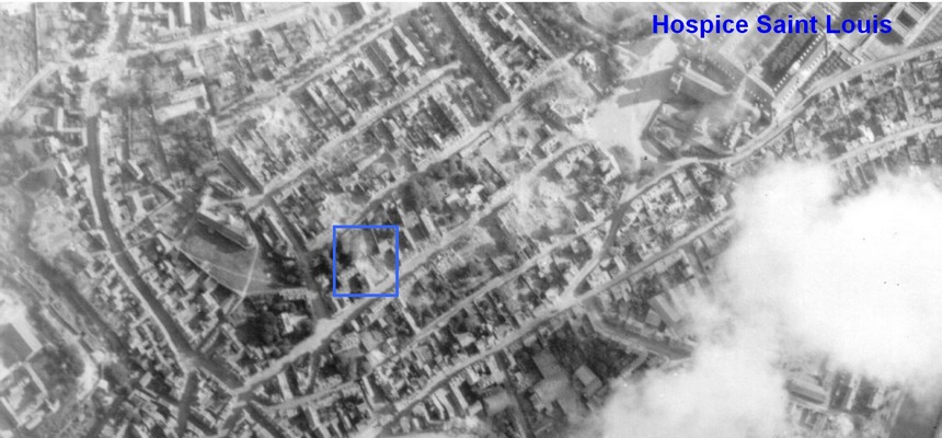 Collection Heintz. Vue aérienne du 24 juin 1944, à gauche la place Reine Mathilde, au centre le parc entre l'hospice Saint Louis et l'hôpital civil Clemenceau. Le Sud est en bas de l'image. De nos jours.