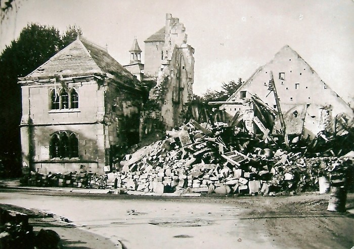 Le couvent de la Charité après le 6 juin 1944, quai Vendeuvre et rue de l'Engannerie, à droite en arrière-plan l'église de la Trinité