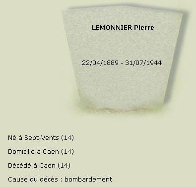 Le 31-07-44, 55e jour - Pendant la nuit, des obus allemands assez nombreux sont tombés dans notre paroisse et l'hôpital. Le pavillon 8, voisin du 9 où se trouvent 60 malades, a été atteint à 3 h du matin. Réveil brusque. A midi 30, deux obus tombent dans la cité Saint Jean-Eudes et blessent un homme assez gravement (cuisse et épaule). M. Lemonnier, pharmacien de l'hôpital, est décédé victime des obus. Un retour au pavillon des contagieux. Distribution de la