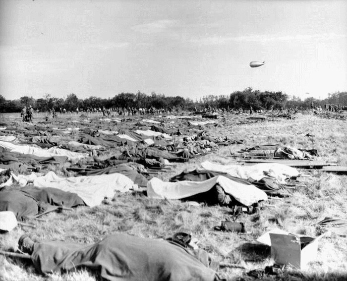Soudain une odeur infecte s'infiltre dans nos narines, une odeur de viande avariée qui empoisonne l'air tout autour de nous. En regardant au loin, en direction de la mer, je vois la plaine jonchée de longs sacs verts, des sacs qui renferment, c'est facile à deviner, autant de cadavres. De nombreux soldats s'affairent au milieu d'eux pour les enterrer.