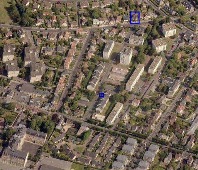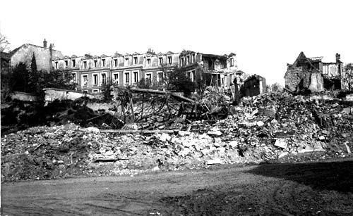 Soudain, une explosion plus violente que les autres nous fait reculer d'un pas. En même temps nous voyons surgir à peu de distance, derrière l'écran des maisons proches, d'énormes nuages de fumée noire qui se bousculent en s'élevant dans l'air. Nous apprendrons un peu plus tard qu'un gigantesque entonnoir a remplacé le passage à niveau de la rue de Bayeux. Pour l'heure, nous suivons du regard six bombardiers qui se dirigent sur nous à faible altitude, et c'est avec soulagement que nous les voyons disparaître par-dessus la toiture de la maison.