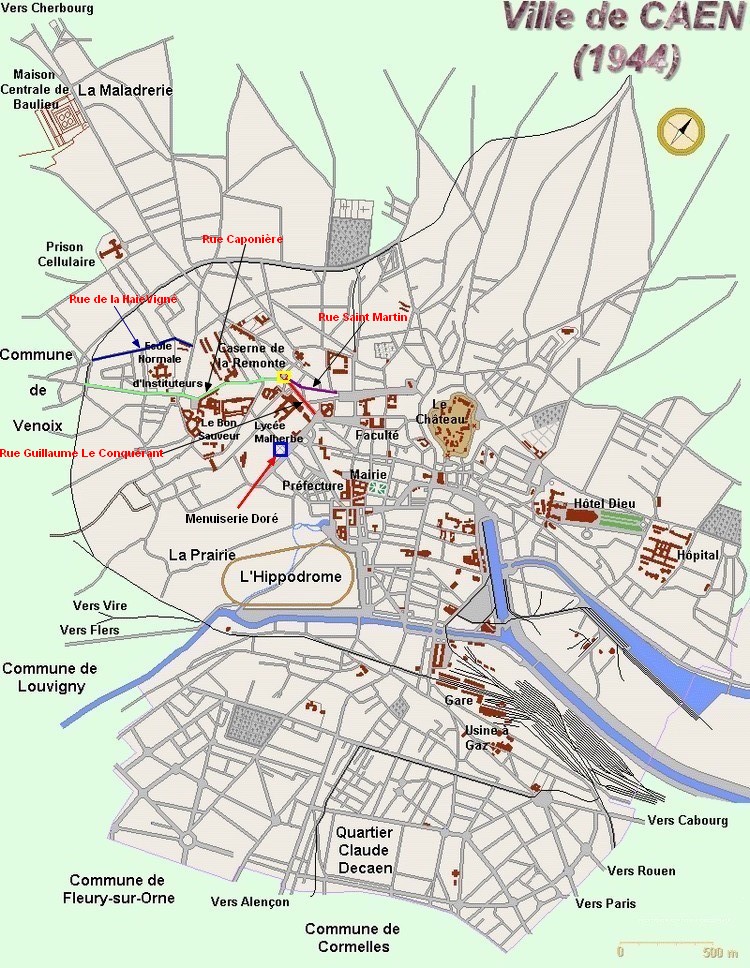 Le lendemain des chars allemands prennent position rue Caponière, tout à côté de chez nous. Effrayés nous partons chez grand-mère à la Haie Vigné(Note de MLQ: quartier au Nord-ouest de Caen), où nous pensons être à l'abri. Hélas, les Allemands viennent, dès la semaine suivante, déposer des munitions dans le champ voisin. Des avions de reconnaissance alliés viennent survoler à basse altitude.... et nous rentrons en toute hâte place des Petites Boucheries.