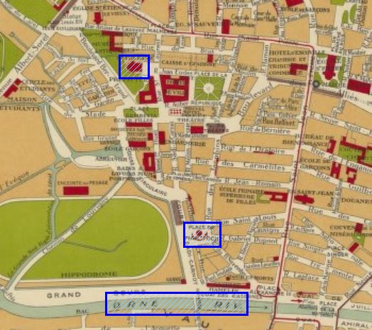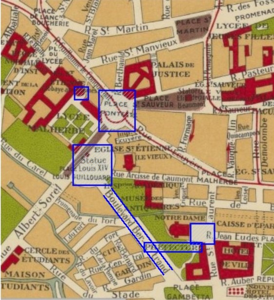 Localisatios: abside de Saint-Etienne, la place des Tribunaux, la place Malherbe, le parvis de Notre-Dame, laPréfecture et le Bd Bertrand.