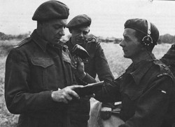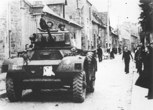 "Photo Archives Départementales du Calvados " Rue Bicoquet, un Daimler Armoured Car MK1 du Inns of Court Regiment (Royal Amoured Car) du I Corps. NB: régiment britannique et non canadien.