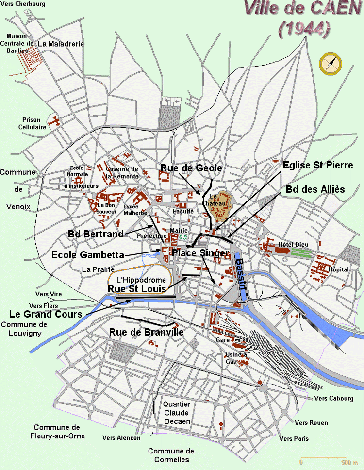 «Mais avec les Canadiens boulevard des Alliés, d'autres soldats débouchent. Ce sont des Britanniques, cette fois! Ils ont traversé la rue de Geôle en flammes au pied du château. (Note de MLQ: certainement la Cie B du Major Hyde, 2nd RUR venant des Fossés Saint Julien) D'autres soldats suivent. Claque un coup de feu. Un Canadien s'écroule vers l'église Saint-Pierre. Toutes les patrouilles s'arrêtent, l'œil aux aguets. La chasse aux snipers commence dans les ruines. Plus à droite, des Sherman suivent le boulevard Bertrand et prennent position aux angles des rues pour tirer vers l'Orne et la Prairie. L'un d'eux est caché derrière l'école Gambetta. De sa mitrailleuse, il arrose les toits des maisons de la rue Branville (de l'autre côté de l'Orne) où se cachent les Allemands. Le bassin et l'église Saint-Pierre délimitent approximativement notre secteur vers l'est. Les avant-postes tiennent les ruines de la Banque de France, rue Saint-Louis