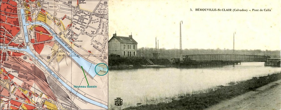 Localisation du pont de Calix à l'aval du Nouveau Bassin sur le canal de Caen à la mer; à droite une carte postale.