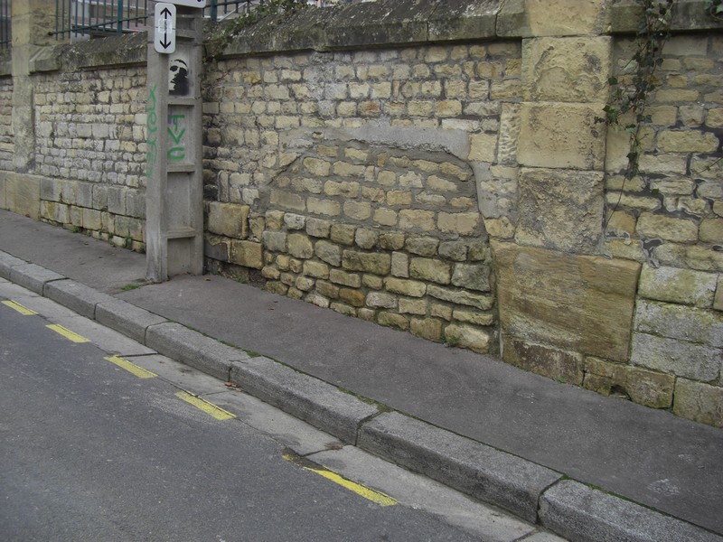 La trace d'un abri allemand au 16 rue de l'Académie, siège d'un dépôt du Génie de la 716.ID (le Pionier-Bataillon 716, Kommandeur : Major Kurt Salzenberg dont le PC était à proximité dans l'emmeuble Pelpel, rue Saint Gabriel). Avant guerre: Ecole de Dressage et après la libération la caserne des pompiers de la ville de Caen.