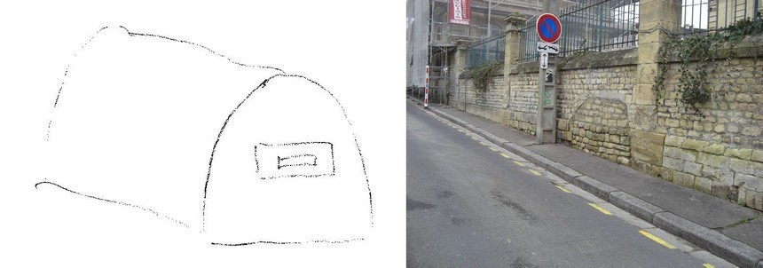 Croquis de Philippe Bauduin, l'abri en préfabriqué de type allongé en béton était un peu ventru et débordait sur le trottoir, la meurtrière était dirigée vers le bas de la rue de l'Académie. Le tireur qui était allongé entrait par l'intérieur de la cour du pavillon du directeur de l'Académie.
