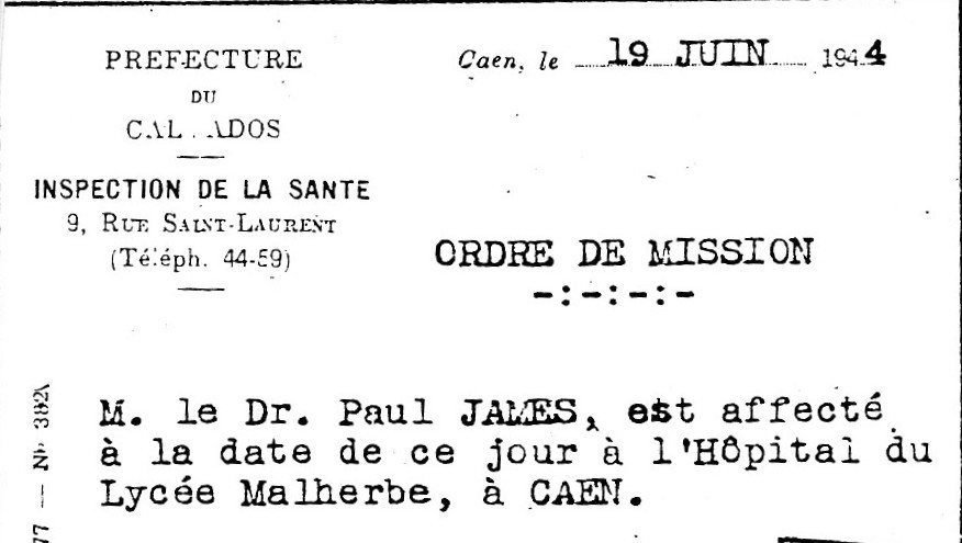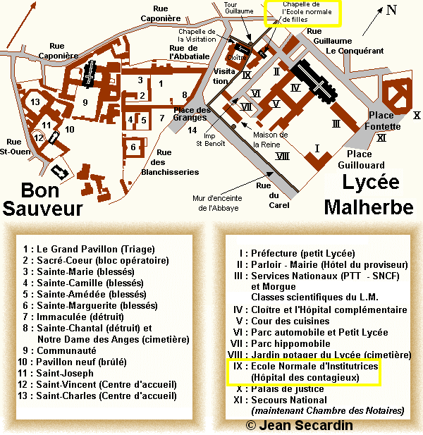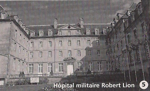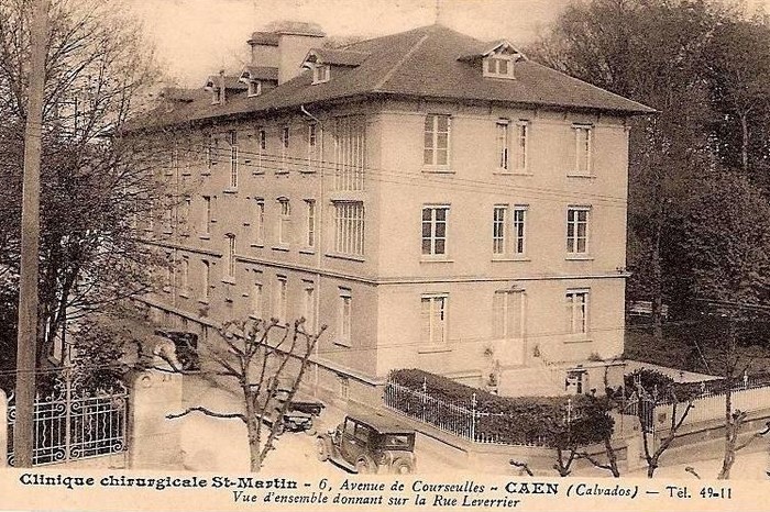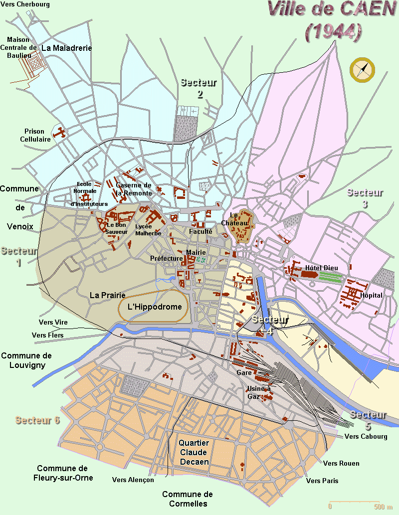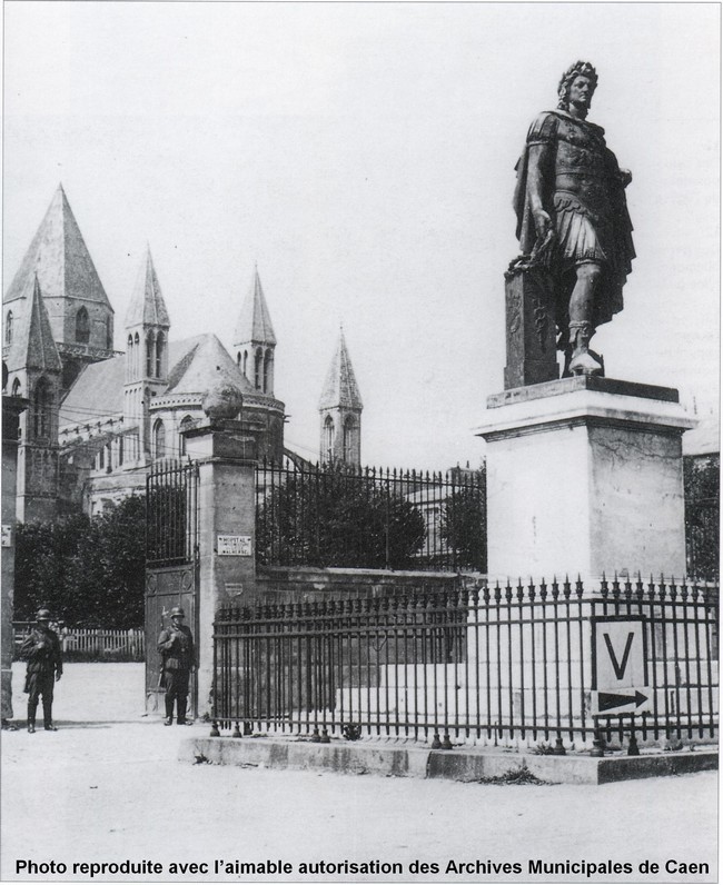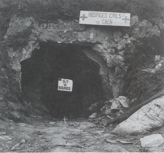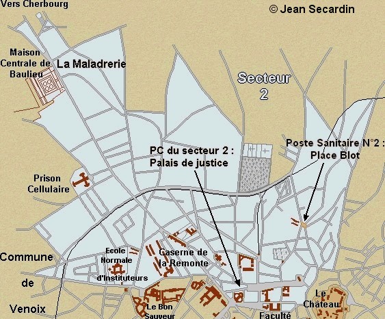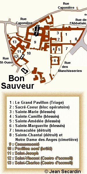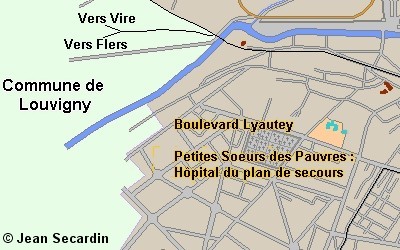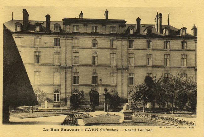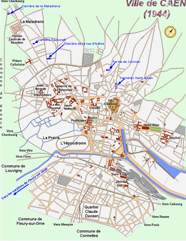 NB : l’hôpital civil de la route de Ouistreham, était au début de la bataille un Kriegslazarett réservé aux allemands, excepté un service de contagieux au Pavillon N°6 une quarantaine de lits, l'Ecole d'Infirmière (directrice Mme Saule) et la Communauté des Sœurs Augustines. Depuis 1940, lors de l'invasion allemande, l'hôpital de Caen, route d’Ouistreham, fut occupé. Les services étaient éclatés au Bon Sauveur, à la Miséricorde, à la clinique Saint Martin et à l’hospice Saint Louis.