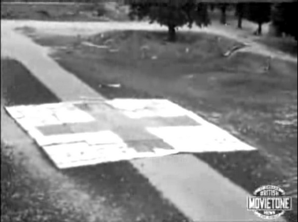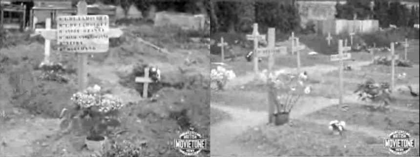 Source film British Movietone News. Des tombes dans les jardins du Lycée Malherbe.