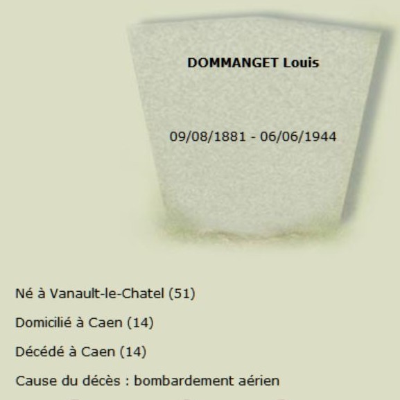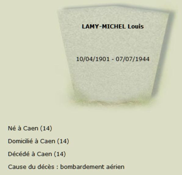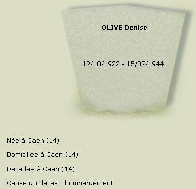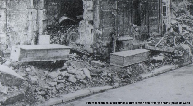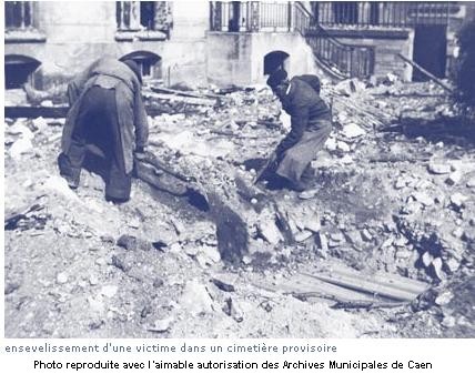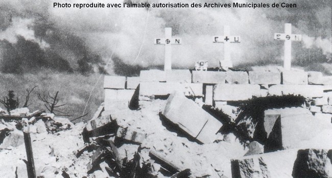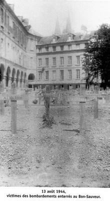 Un au Sépulcre, pour les quartiers Saint-Gilles et le Vaugueux. Témoignage de ma mère, après le bombardement du vendredi soir 7 juillet, « les tombes des tués du 6 juin qui étaient au pied du Sépulcre avaient été retournées si bien que des cinq corps des P… nous n’avons retrouvé que quelques habits qui ont permis de savoir que c’était eux »