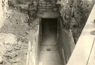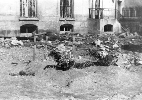 Tombes provisoires de victimes dans la cour arrière de la Banque de France. Il s’agit de Mme Bavay, femme du directeur de la Banque de France et de M Haillard, caissier et son épouse. Ces personnes étaient mortes ensevelies par le bombardement du 7 juin vers 03H30.